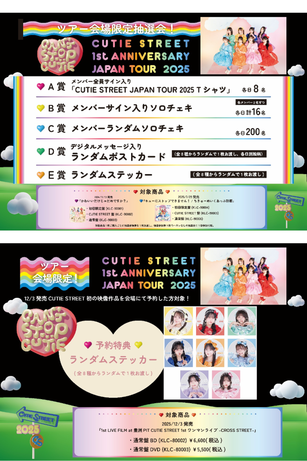 CUTIE STREET 1st ANNIVERSARY JAPAN TOUR 2025「CAN'T STOP CUTIEにて、CD購入者を対象に豪華景品が当たる抽選会および、12/3発売CUTIE STREET初の映像作品を会場にて予約した方を対象のキャンペーンの実施が決定いたしました。ツアー会場での限定施策となりますので、奮ってご参加ください!